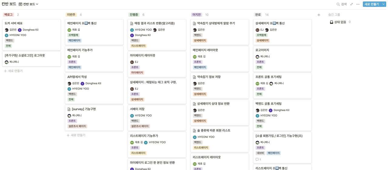 툴 또한 기존 각자 쓰던 방식 중에 가장 좋은 방식들 위주로 통합하고, 기존 노션과 트렐로를 함께 사용하며 발생한 문제, 즉 어느 한쪽을 소홀히 하게 되는 것을 방지하기 위해 노션에서 칸반까지 함께 관리하기로 하였다.(트렐로 굿바이..)