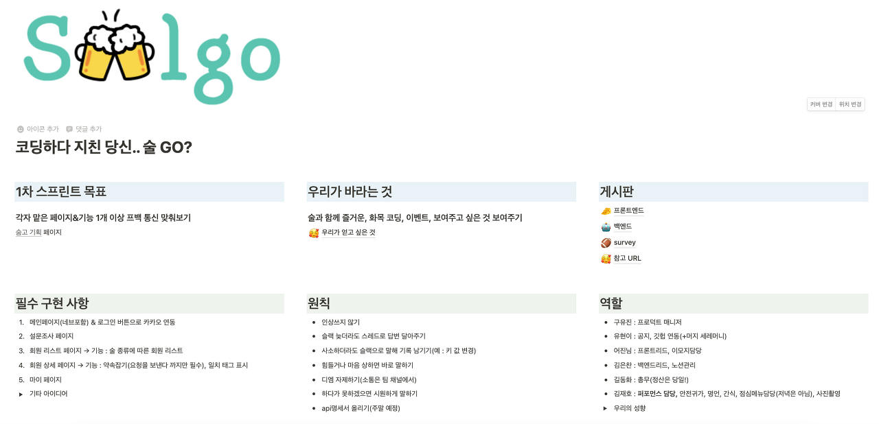 우리는 '술고'에 적용할 페이지와 기능들을 정리했고 이 외에도 1차 프로젝트 때처럼 원칙과 역할, 그리고 이번에는 더 추가하여 우리가 바라는 것(최종 발표날의 우리 모습 상상하기) 등의 이야기도 나누었다.