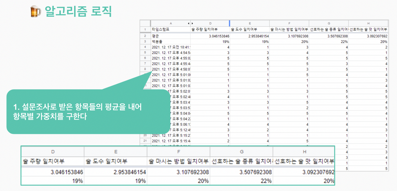 서론이 길었는데 본론으로 들어가자면, 우리는 우리끼리만 만족하기 보다는 고객의 니즈를 확인하고 고객의 만족도를 높여주고 싶었다. 그래서 술 취향 항목별로 중요도에 대한 구글 설문을 돌리기로 하였다. 고객들이 무엇을 중요시 여기는지 알 수 있다면 더 고객 친화적인 알고리즘을 짤 수 있을 것 같았다.