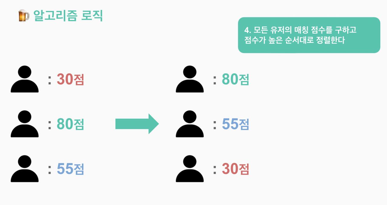 문제점은 이 뿐만이 아니다. 항목별 일치하는 수에 따라 점수가 높아지다 보니, 중복 선택 항목을 많이 선택한 사람은 그 누구와도 높은 점수가 나오는 문제가 생겼다. 즉, 중복 선택 항목을 모두 선택하기만 하면 술 취향 매칭 시 최상단에 올라가게 되는 것이다.