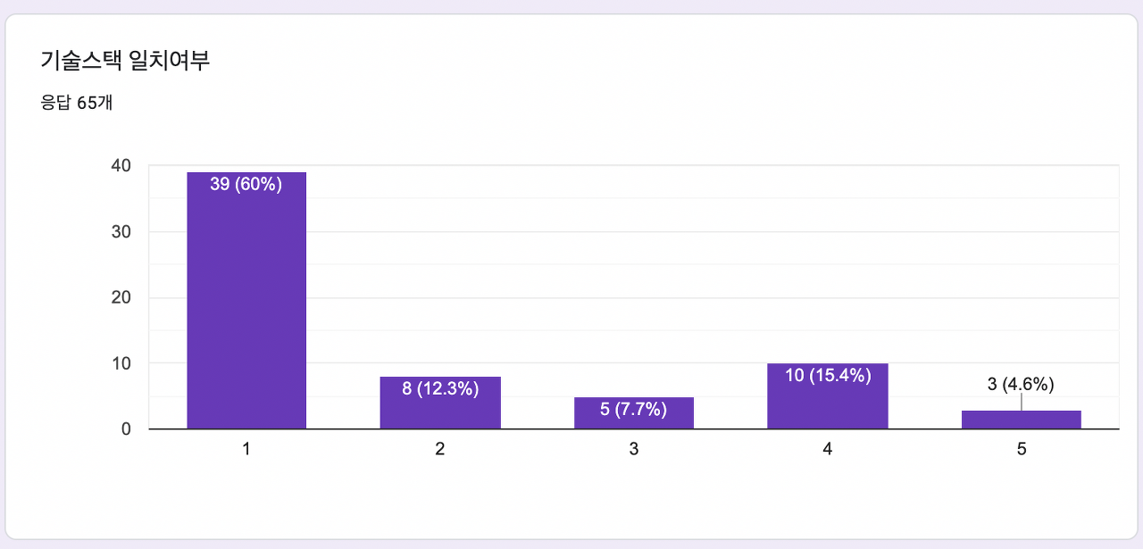 '기술 스택' 항목의 경우를 예로 들어보겠다. 응답자 평균으로 볼 때 현재의 알고리즘은 기술 스택의 중요도를 평균 ‘2’로 보고 점수를 매긴다. 하지만 실제 다수의 응답자들의 기술 스택 중요도는 ‘1’이다. 또한 반대로 기술 스택이 매우 중요하다고 답한 3명은 자신의 취향과는 전혀 다른 엉뚱한 사람들과 매칭 된다. 즉 이 알고리즘은 개인 맞춤형이라고 말할 수 없는 것이다..