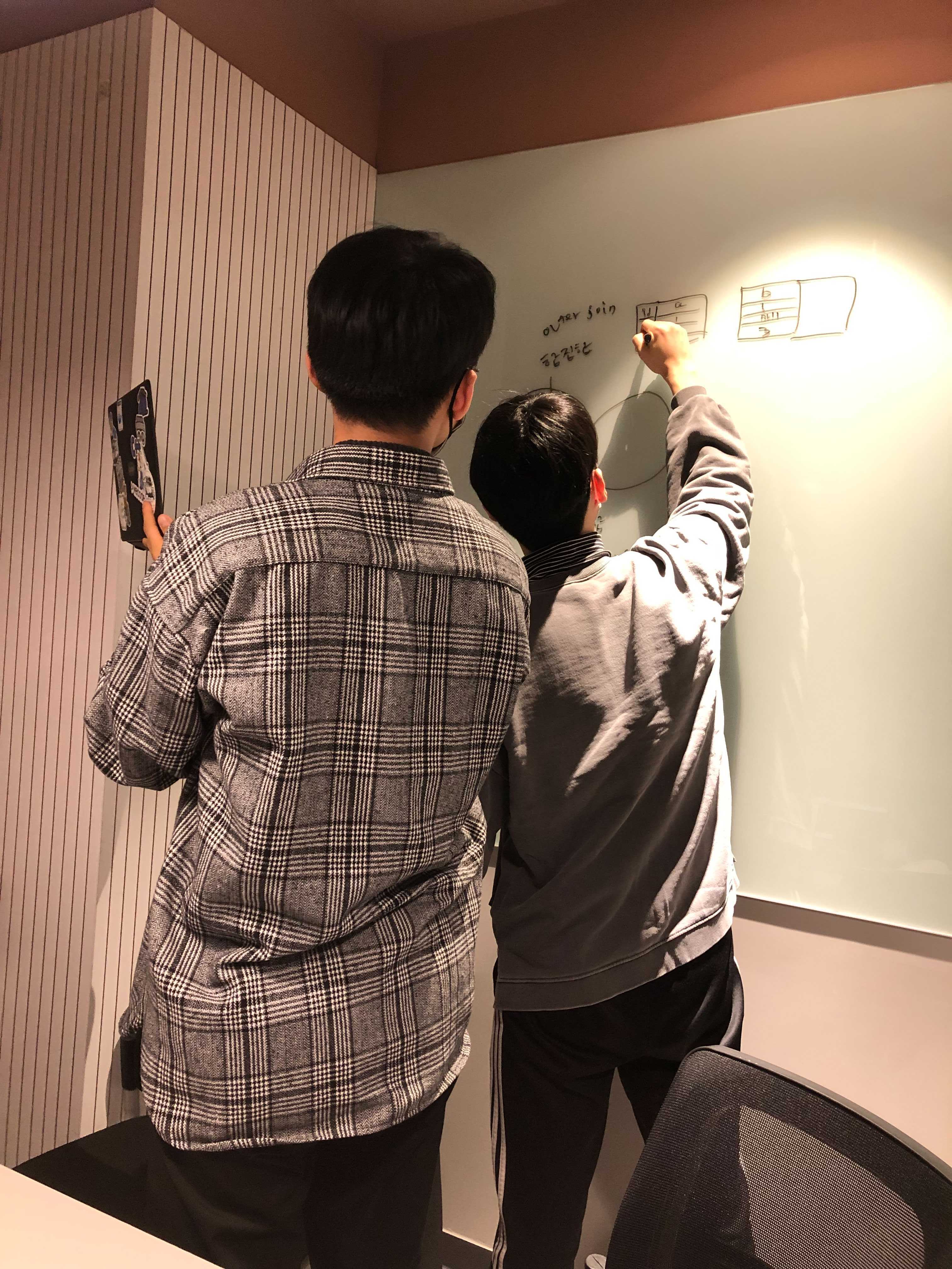 온라인으로 참석한 팀원들에게 칠판으로 설명해주시는 종호님!