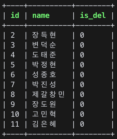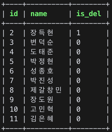 테이블에서 데이터가 지워진 것이 아닌 'is_del'이라는 열의 값이 0에서 1로 변한 것을 볼 수 있다.