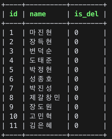 현재 데이터베이스에는 다음처럼 11명의 이름 정보가 있다.