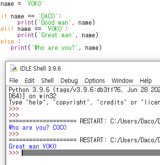 근데 다른 언어에서는 if, else, else if 이렇게 사용하는데 파이썬에서는 else if 를 elif 로 줄여서 사용하는 것 같다.