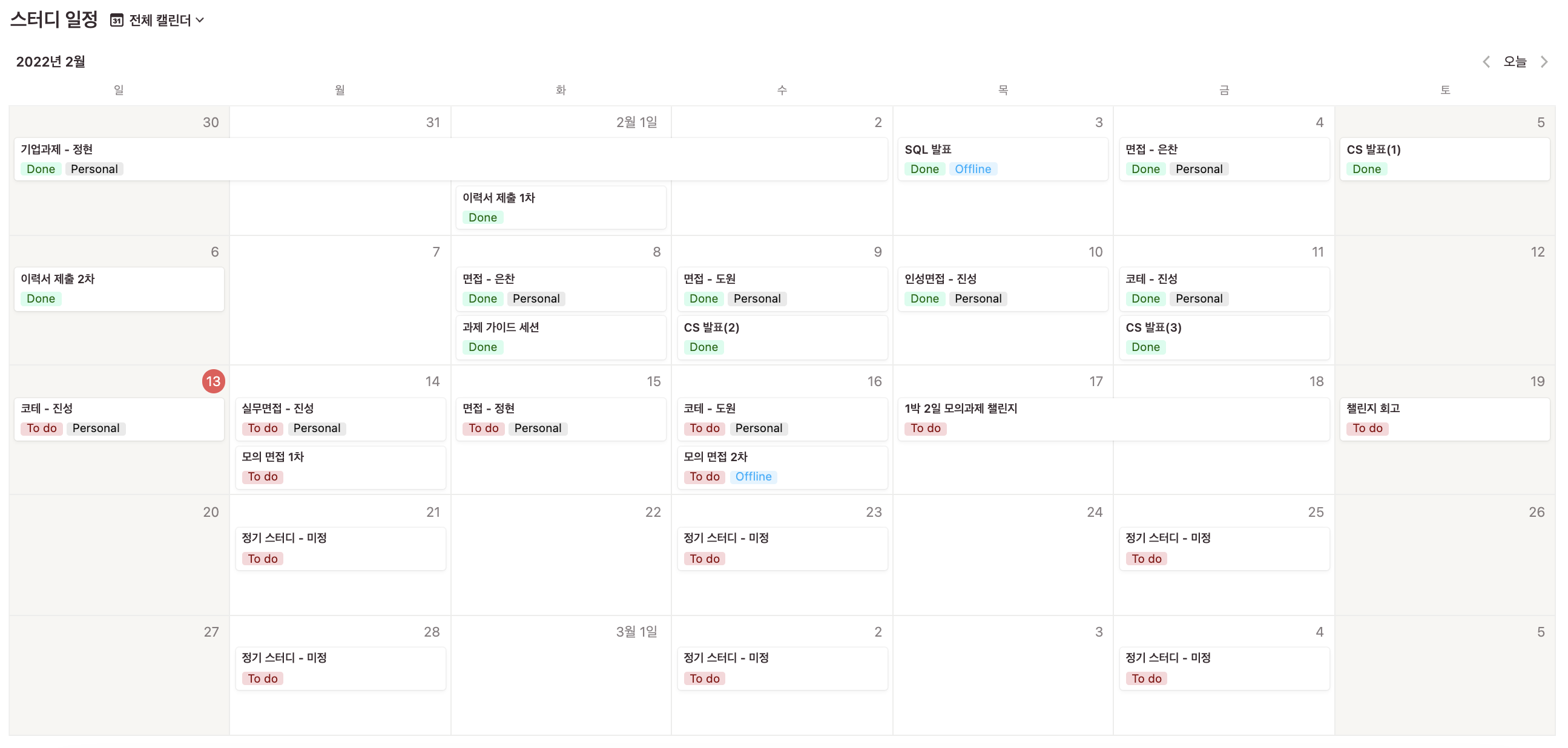 캘린더를 보면 알겠지만 우리 스터디는 딱딱하게 정해져 있는 커리큘럼이 아닌 그때그때 우리 상황에 맞게 학습 계획을 세우고 실천하고 있다. 학습 계획은 보통 1주 전에 확정하고, 이후 피드백을 반영하여 새로운 계획을 다음 주에 반영하는 식이다.