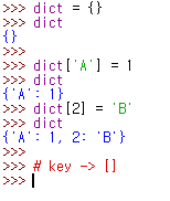 > 딕셔너리에 키를 추가할 때는 [] 와 = 을 사용한다