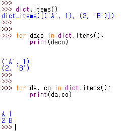 - 딕셔너리이름.items() >>> 키와 값을 함께 출력하는 메서드