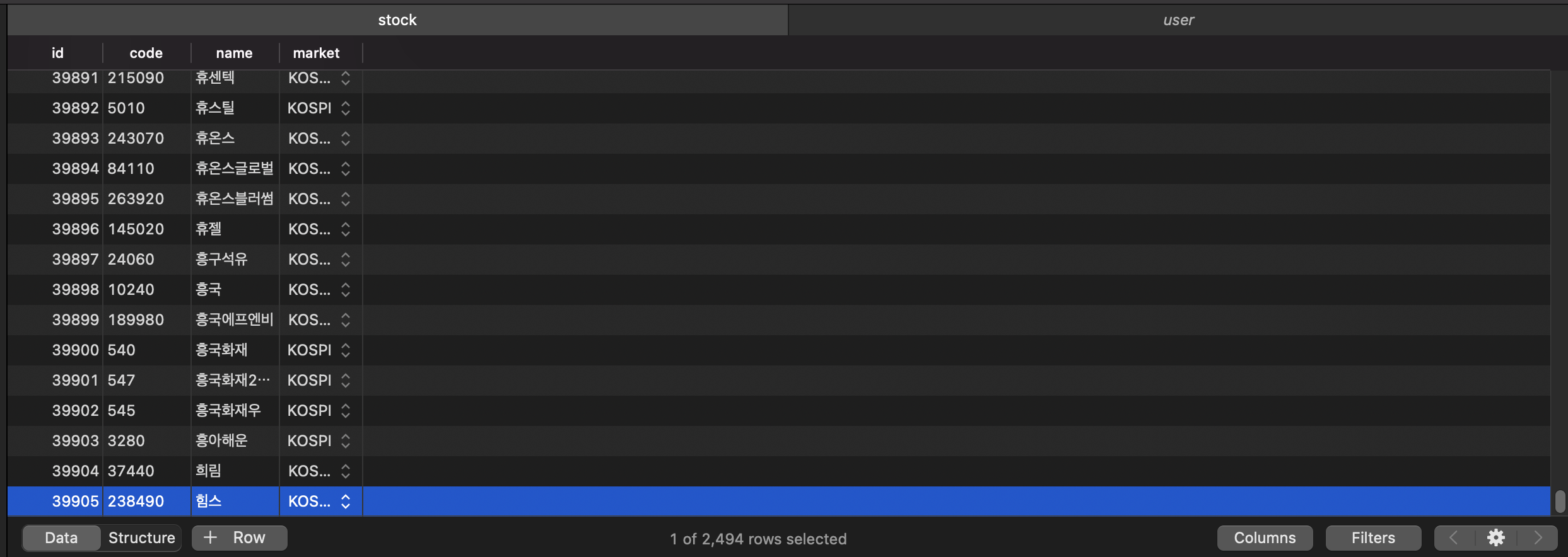 밑에 rows 수를 보시면 2,494개의 종목이 정상 업로드된 것을 확인할 수 있습니다.