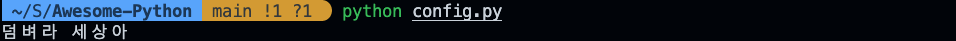 터미널에 python config.py 명령어로 파일을 실행해보면 ‘덤벼라 세상아’가 출력되는 것을 확인할 수 있다.