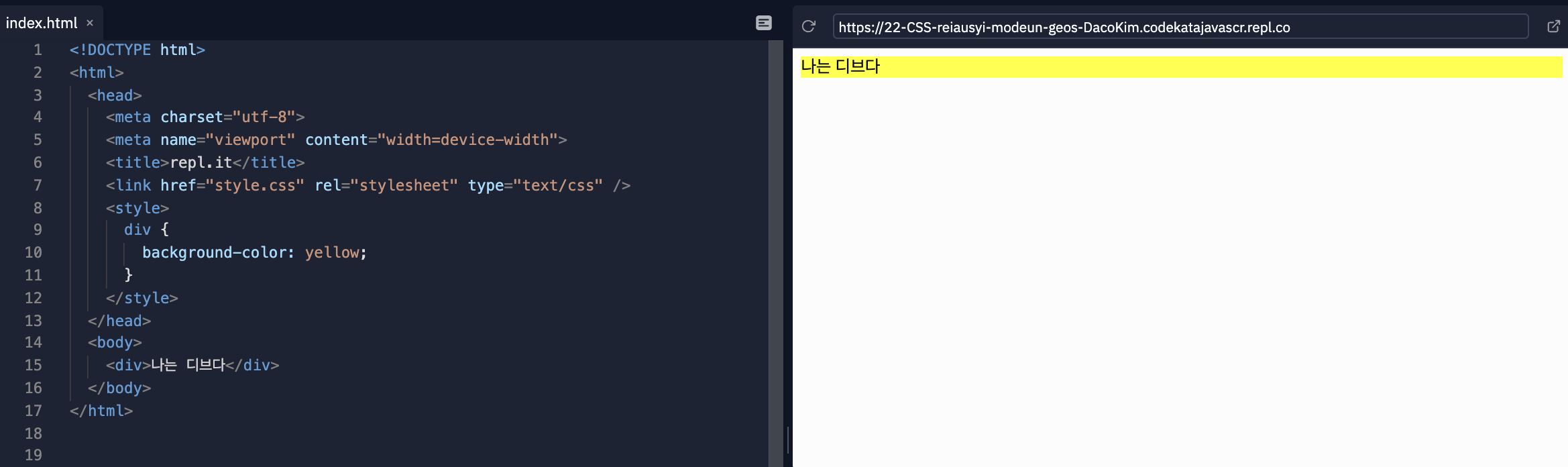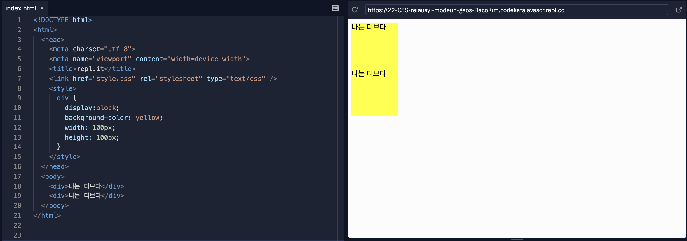 착해진 div 에게 다시 block를 부여했다. (div는 원래 block 이기 때문에 따로 부여하지 않아도 되지만 확실한 이해를 돕고자 부여함)