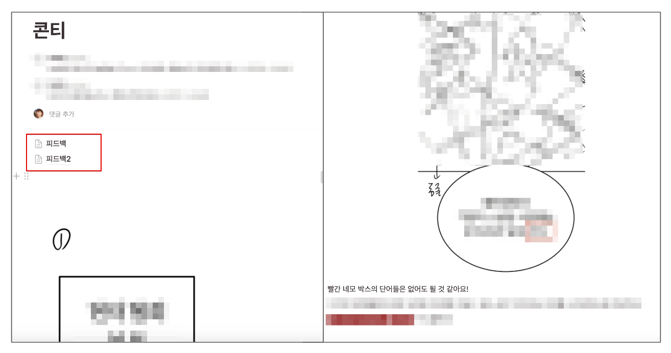 우리는 스토리가 나오고 이를 콘티, 선화로 넘어갈 때마다 대사와 연출을 점검하는 피드백 과정을 거치는데, 특히 이 피드백 과정이 비효율적이고 피로하다는 문제가 있었다. 기존 피드백은 노션에서 이루어졌는데 글과 관련된 것이라면 댓글기능을 사용하여 피드백을 나누기 좋으나, 이미지의 경우 세로로 길기 때문에 원하는 영역에 댓글을 남길 수가 없었다. 하여 매번 영역을 캡처해 피드백을 따로 남기거나 컷수를 기재하여 내용을 남기곤 했다.