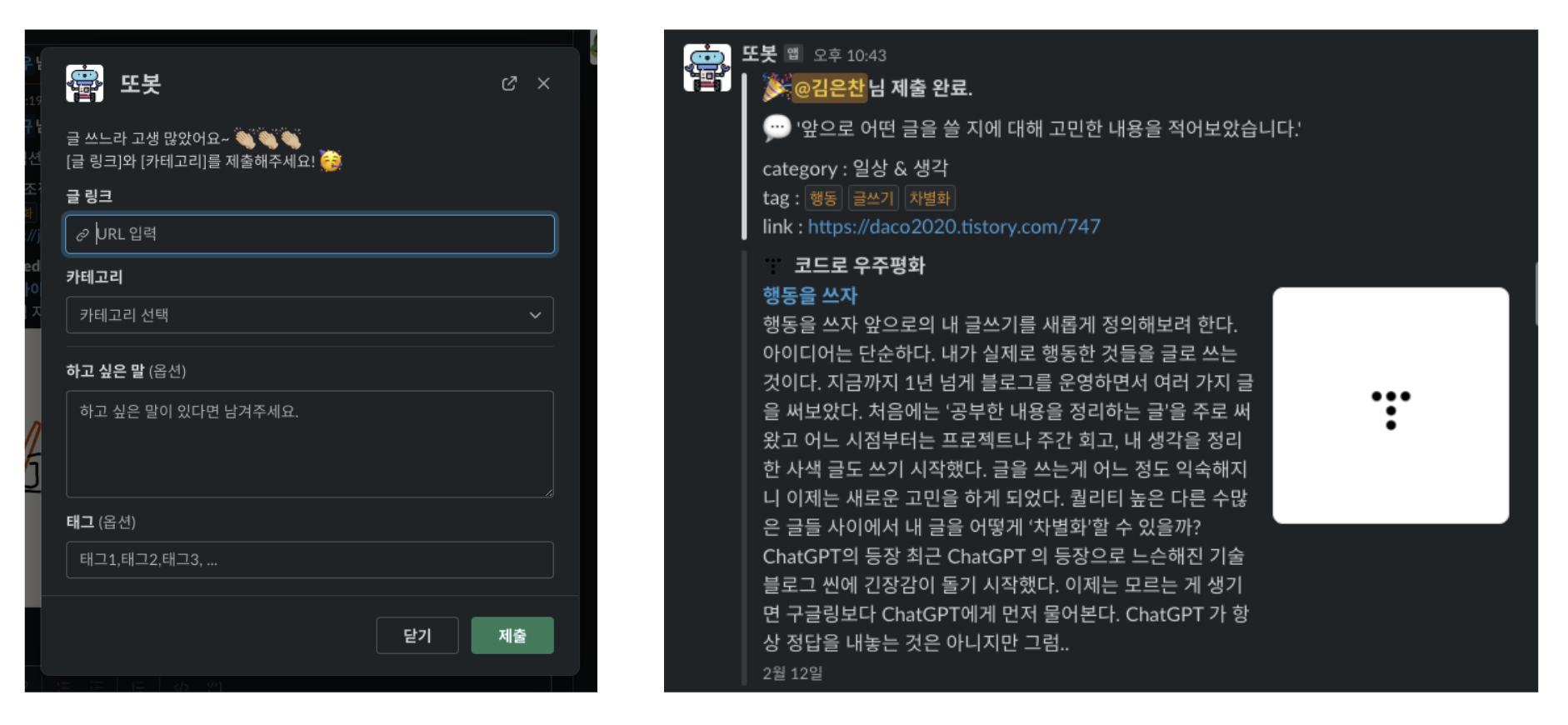 또봇의 경우 '/제출'과 같은 명령어를 통해 호출한다. 사용자가 '/제출' 명령어를 입력하면 왼쪽의 모달창이 나타난다. 모달창에서 글 링크와 카테고리를 입력 후 하단 제출버튼을 누르면 오른쪽 이미지처럼 또봇이 슬랙 메시지를 응답해 준다.