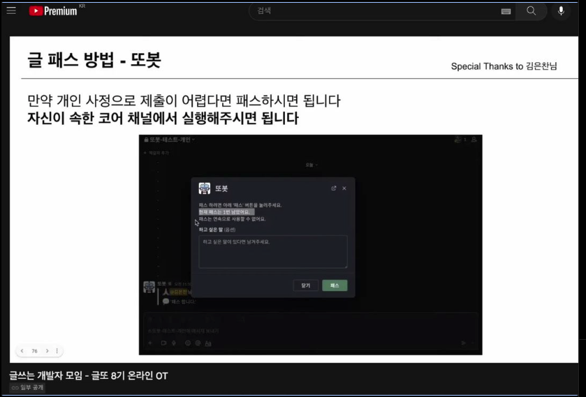 본격적으로 글또 8기가 시작되기 전, 유튜브로 글또 OT가 진행되었다. 그리고 성윤 님의 소개로 또봇이 공개되었다.