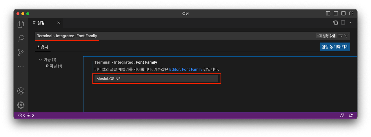 2. `Terminal › Integrated: Font Family` 을 검색한 후 해당 설정에서 터미널에 적용하고 싶은 폰트 이름를 입력한다. (설치된 폰트만 적용할 수 있다)