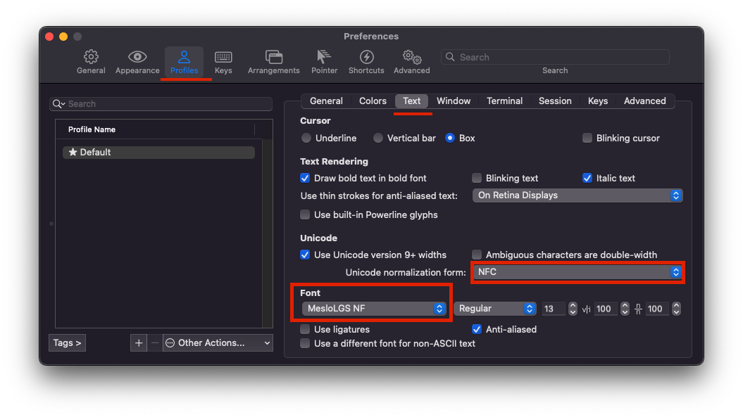 터미널 테마 설정 과정에서 iTerm2 나 vscode 상에서 폰트가 깨질 수 있다. 이 경우 iTerm2 폰트 설정, 그리고 vscode Terminal 폰트 설정을 통해 폰트 깨짐 문제를 해결할 수 있다. 만약 폰트 깨짐 현상이 없다면 아래 내용은 적용하지 않아도 된다.