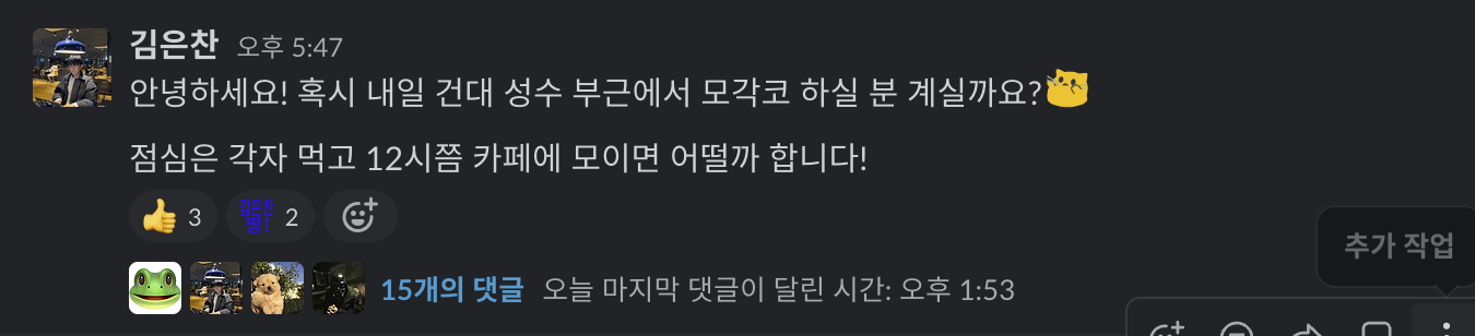 나는 글또라는 개발자 글쓰기 커뮤니티에 참여하고 있는데 글또 커뮤니티에서는 커피챗이나 모각코 등 소모임 활동이 활발하다. 덕분에 나는 나와 같은 지역에 거주하는 다른 개발자들과 종종 모각코를 하고 있다.