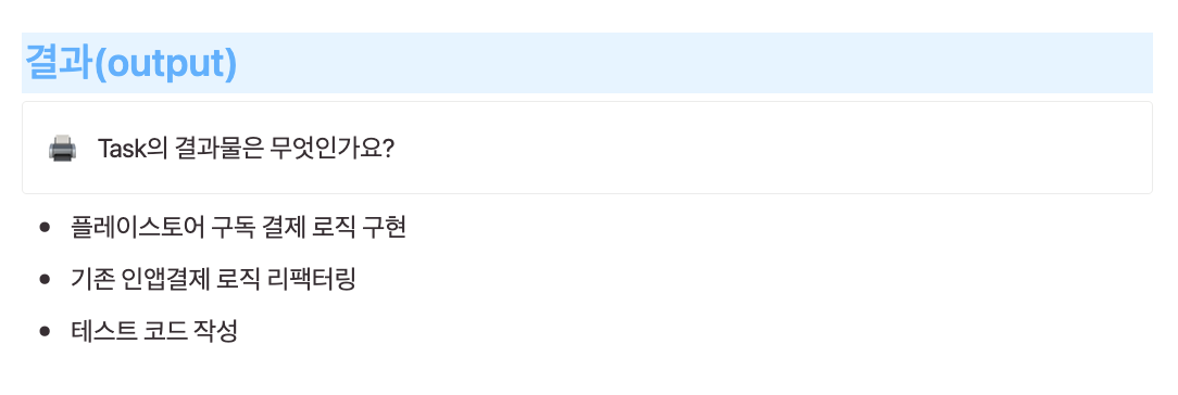 나는 개발자이고 우리 조직은 Task 단위로 업무를 수행한다. 위에서 언급한 '결제 기능' 예시처럼 작은 단위의 Task를 생성하여 업무를 수행한다. Task는 템플릿을 활용해 작성하는데 기존 Task 템플릿은 [설명], [작업내용], [관련링크]처럼 간단하게 구성되어 있다.