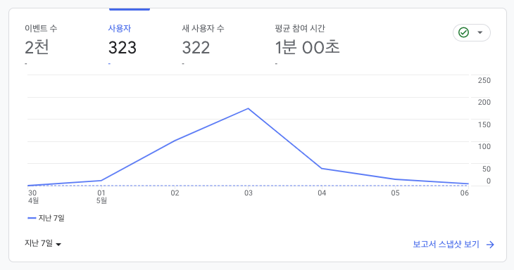 처음에는 가까운 지인들에게 먼저 보내보고, 카카오 애드핏 광고가 붙고 나서는 참여하고 있던 커뮤니티에도 공유했다. 아래는 이번 한 주간의 성적이다.