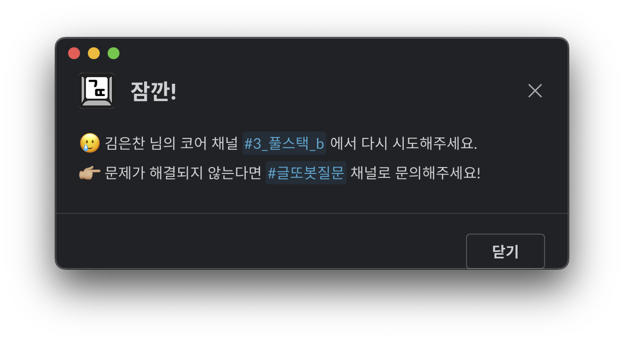 '/제출' 과 '/패스' 명령어는 본인이 속한 코어 채널(소그룹 채널)에서만 호출할 수 있는데요. 만약 다른 채널에서 명령어를 호출하면 아래와 같은 에러 모달을 만나게 됩니다.