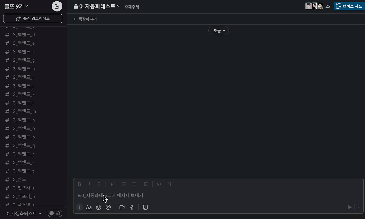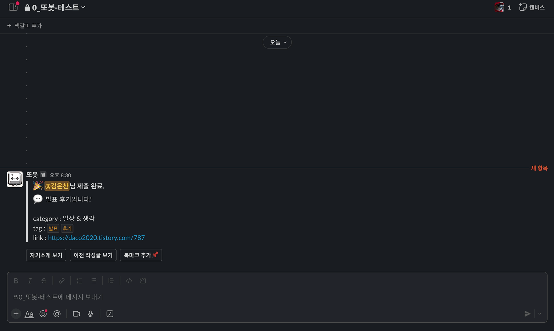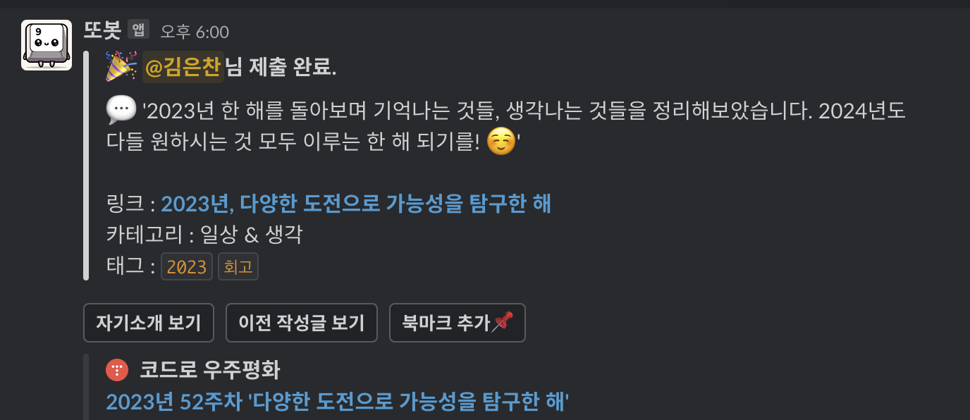 글 제출을 완료하면 멤버가 속한 채널에 다음처럼 또봇이 메시지를 남겨줍니다.