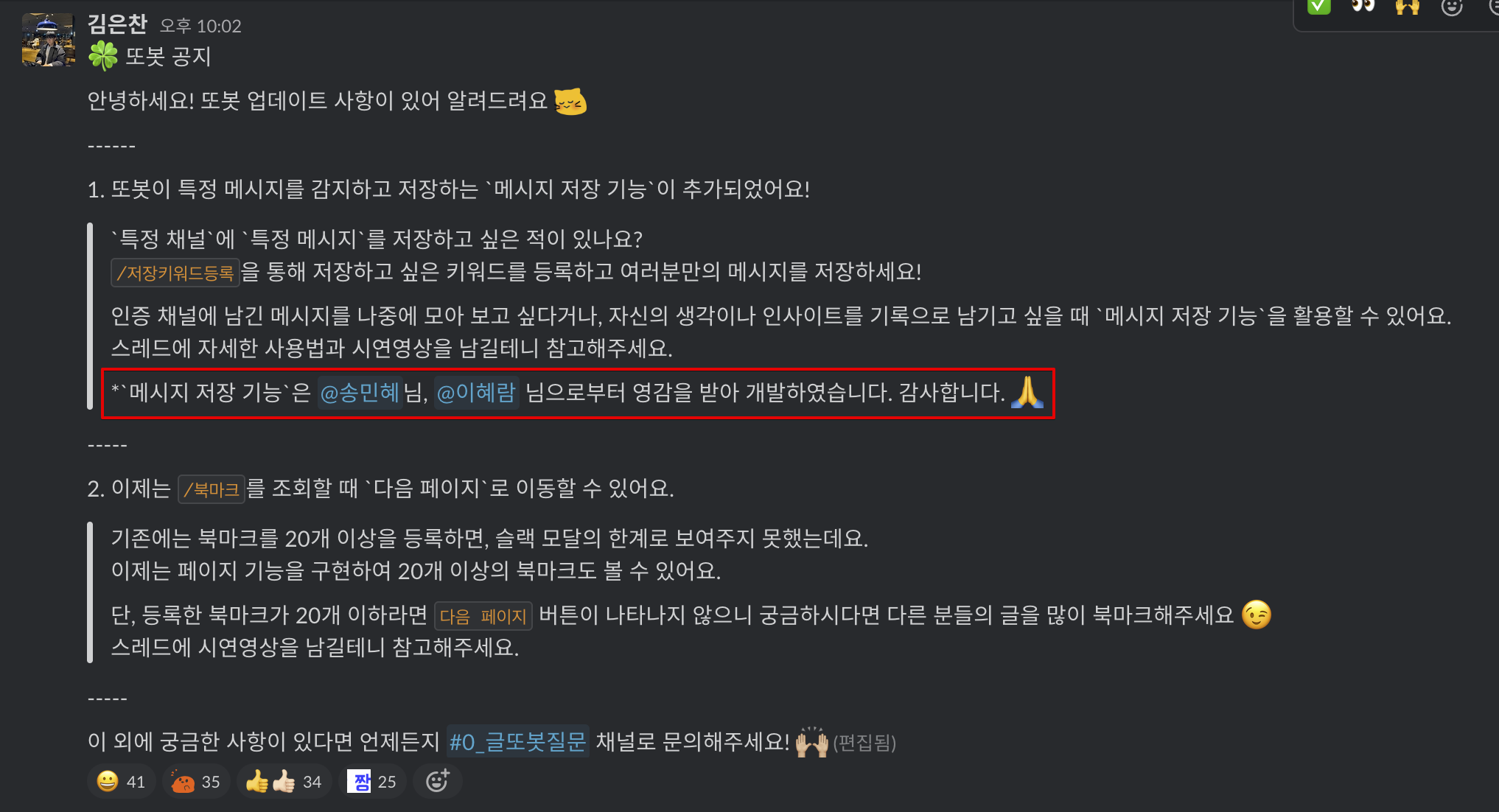 또봇은 새로운 기능이 추가될 때마다 멤버들에게 공지를 해주는데요. 공지 사항에는 해당 기능이 누구로부터 시작된 것인지 분명하게 알려주고 있습니다. 저는 멤버들의 아이디어를 구체화하고 커뮤니티에 구현하는 역할을 맡고 있는 것이죠. 그러니 또봇은 저 혼자가 아닌 멤버들과 함께 만들었다고 할 수 있습니다.