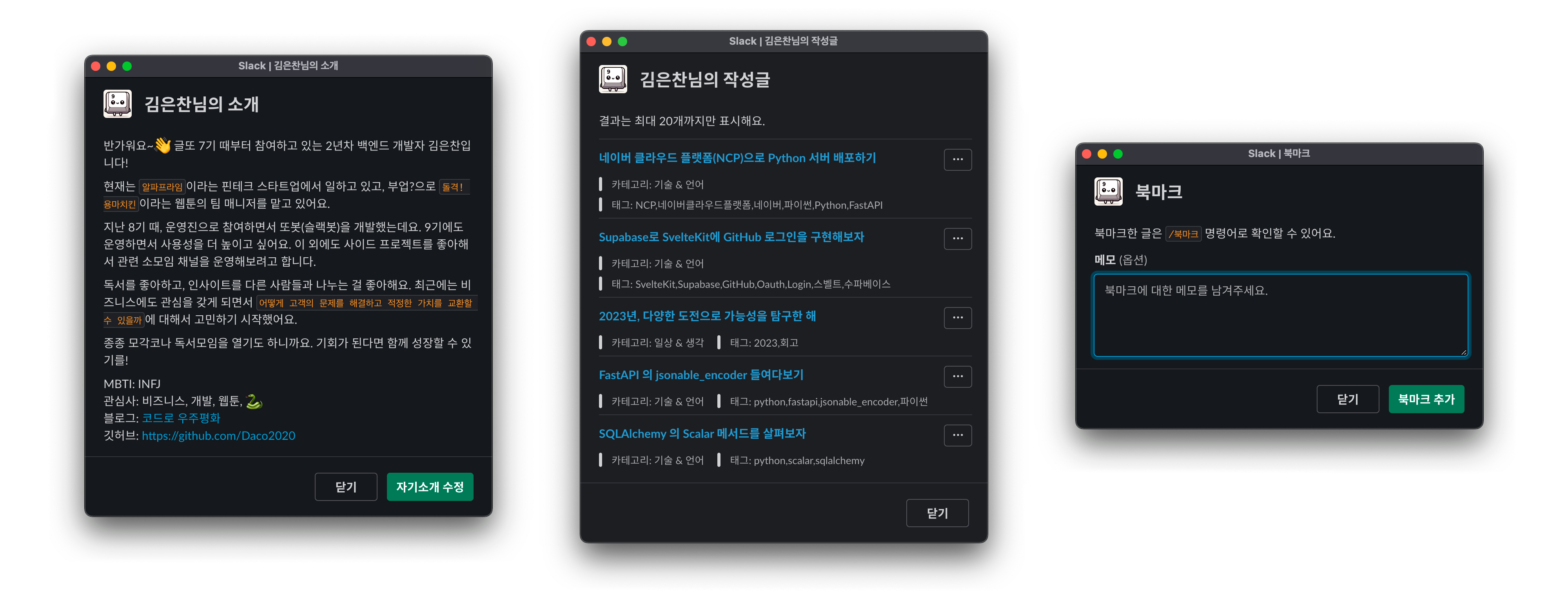 [자기소개 보기] 는 글또 활동을 시작할 때 멤버 본인이 남긴 자기소개입니다. 슬랙은 시간이 지나면 메시지가 사라진다고 말씀드렸죠? 자기소개로 올린 메시지 또한 시간이 되면 사라지기에 멤버들은 서로에 대한 정보를 얻기가 어려웠습니다. 그래서 또봇은 글 제출 시 글쓴이가 어떤 사람인지 쉽게 알 수 있도록 자기소개 정보를 제공합니다.