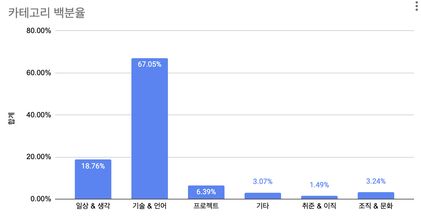 카테고리나 태그는 글의 메타데이터입니다. 카테고리나 태그는 글 검색이나 통계에 활용하기 위하여 수집합니다. 아래 차트처럼 멤버들이 어떤 카테고리의 글을 많이 쓰는지도 알 수 있죠.