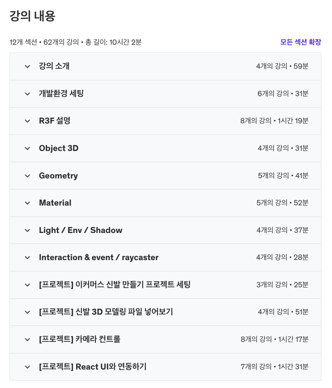 강의 커리큘럼을 보시면 개발환경 세팅부터 R3F의 기본 개념을 차근차근 설명해 줍니다. 제가 처음 강의를 들은 것은 1월 경이었는데 현재까지도 강의가 꾸준히 업데이트되고 있습니다. 커리큘럼 아래쪽의 [프로젝트]처럼 후반부는 프로젝트 베이스로 진행되기 때문에 실전 경험을 쌓고 싶은 분들에게 특히 더 추천드립니다!
