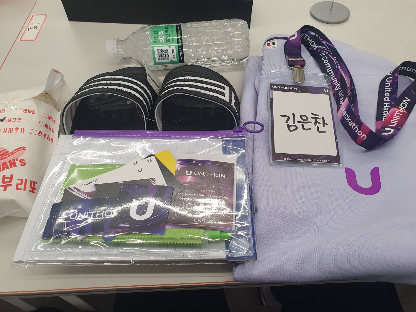 유니톤 참가비는 무료이며 기업 후원을 통해 운영되는 행사입니다. 참가비가 무료임에도 2박 3일 동안 식사부터 간식, 이벤트 상품까지 풍족한 환경을 제공해 주죠. 아래 사진은 이번 11회 유니톤의 웰컴키트입니다. 맨투맨에 슬리퍼? F인 저는 시작부터 감동할 수 밖에 없었습니다..😂