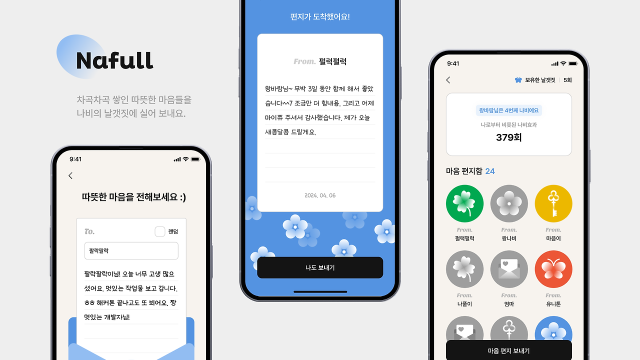 '나풀'은 처음 보기에는 이해하기 어려울 수 있습니다. 설명하자면 누군가 나에게 메시지를 보내면, 그 메시지를 확인하기 위해서 다른 이에게 메시지를 보내야 하는, 일종의 메시지 확산을 유도하는 인다이렉트(바로 전달되지 않는, 조건에 따라 전달되는) 방식의 메신저라고 할 수 있습니다. 저 또한 과거에 유사한 메신저를 개발한 경험이 있기에 이 '나풀'이 흥미로웠습니다. 다만,, 행사가 끝나고 저한테 온 메시지를 확인하려고 했을 때 서버가 닫혔는지 제대로 동작하지 않더군요.. 개인적으로 아쉬웠습니다.