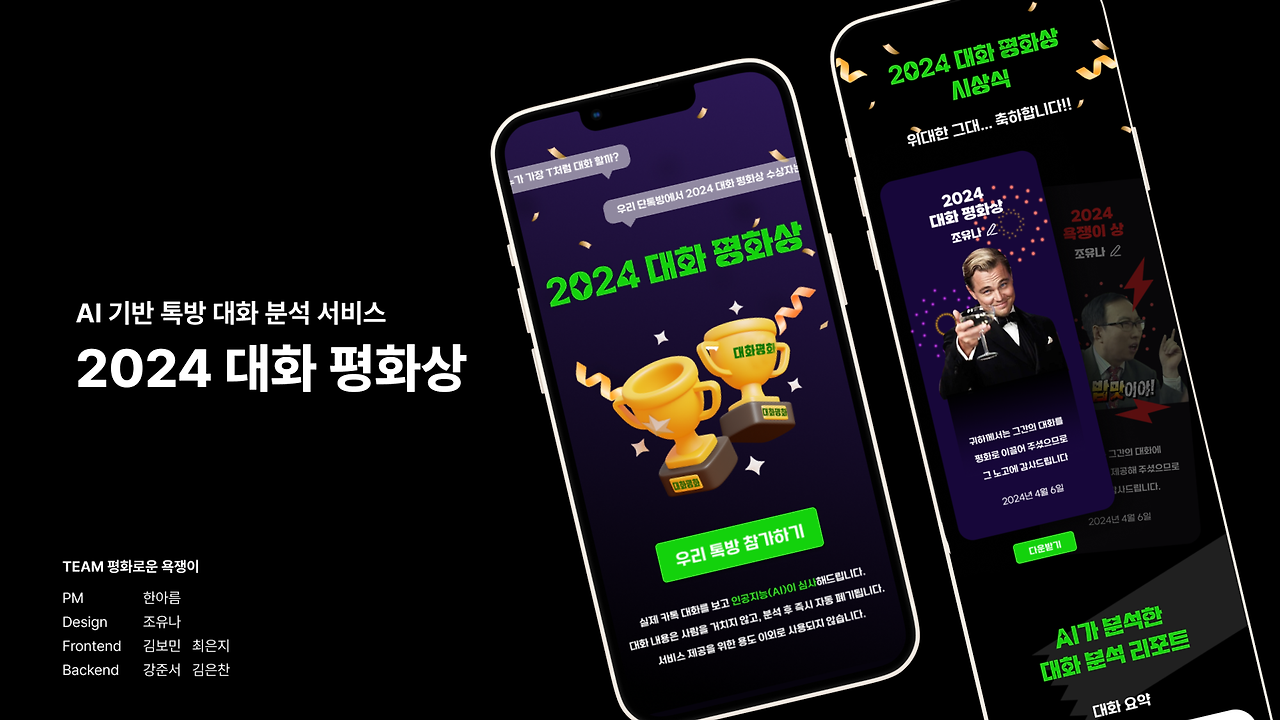 [2024 대화 평화상]은 카톡의 대화내용을 분석하여 대화 참여자들의 평화 점수를 매기고, 점수에 따라 '대화 평화상'과 '욕쟁이 상'을 주는 서비스입니다. 결과 리포트에는 평화 점수뿐만 아니라, 카톡의 대화내용을 5가지 말투로 요약해 주고, MBTI 밈을 이용해 재미 요소를 추가했죠.