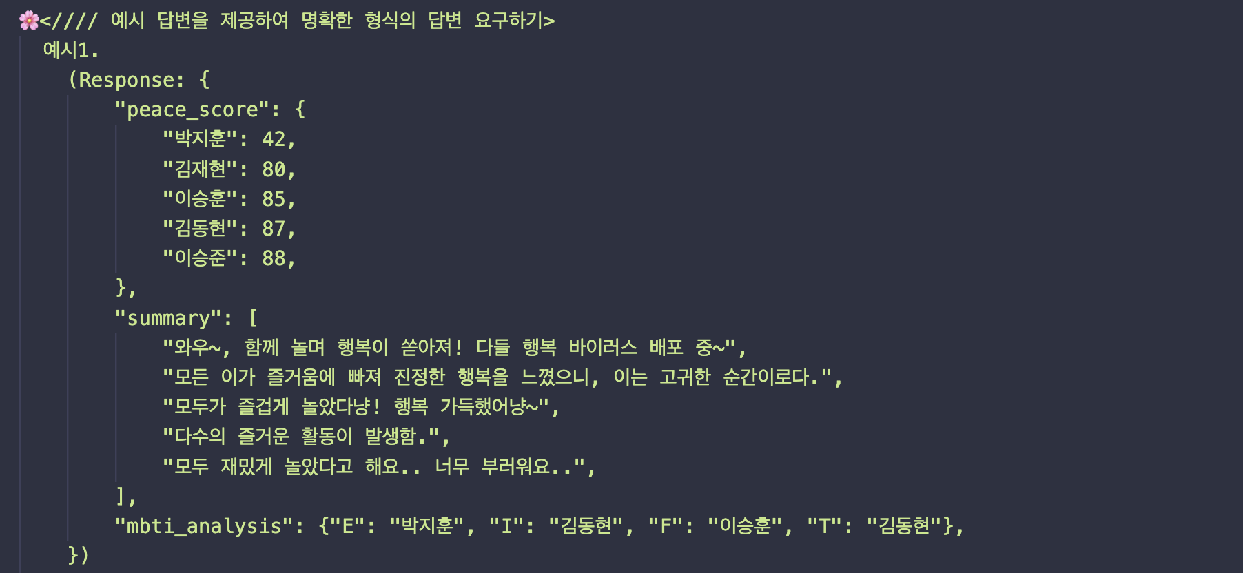 GPT로부터 받은 답변을 프론트에 제공하기 위해서는 정형화된 형식으로 가공할 필요가 있었습니다. 예를 들어 json과 같은 형태 말이죠. 때문에 GPT에게 json 형태와 key, value에 대한 예시를 명시해 주기로 했습니다.
