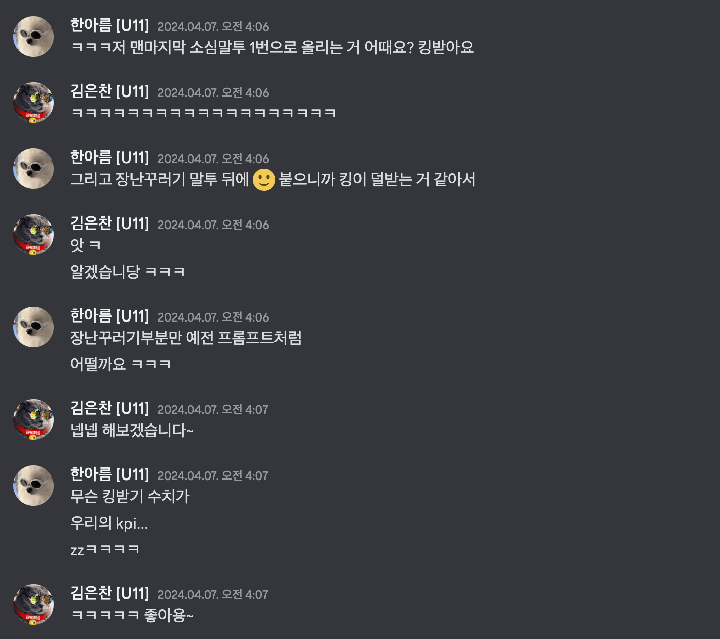 한편 프롬프트를 통해 평화 점수를 구할 때, 점수가 동점이 나오는 경우가 있었습니다. 점수가 동점이 되면 누가 평화상을 받을지, 누가 욕쟁이 상을 받을지 구분하기 어려운데, 이 부분은 같은 백엔드이신 준서님의 도움으로 해결할 수 있었습니다. 준서님이 수정하신 프롬프트로 대화 참여자들이 동일한 점수를 받지 않도록 개선할 수 있었습니다.🙏