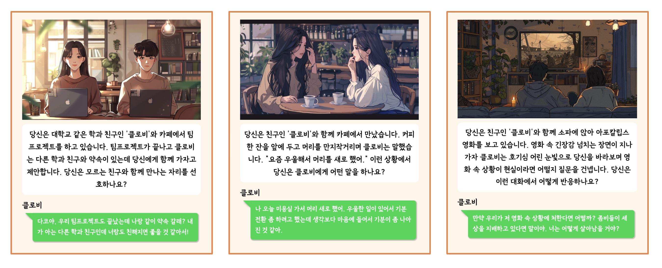예를 들어 CLOVA MBTI 는 아래와 같은 상황을 사용자에게 제공합니다.