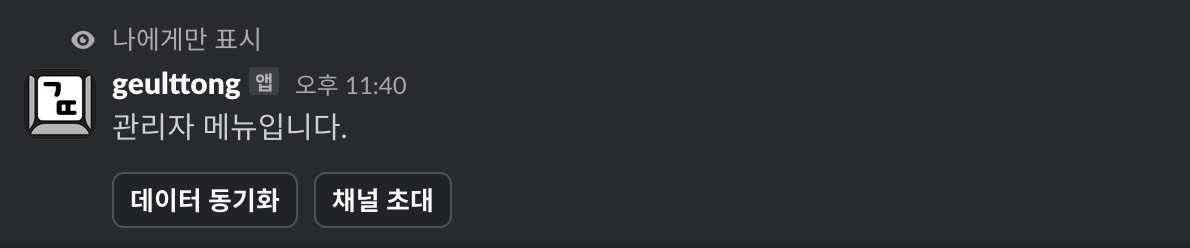여기서 chat_postEphemeral을 사용해 메시지를 관리자 본인에게만 보이도록 설정했습니다. 이렇게 하면 어디서 명령어를 입력해도 관리자 본인만 볼 수 있겠죠.