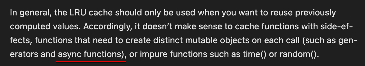 첫 번째 차이는 aiocache 는 비동기 함수를 캐싱하는 데 최적화되어 있지만, lru_cache 는 비동기 함수에 부적합합니다.