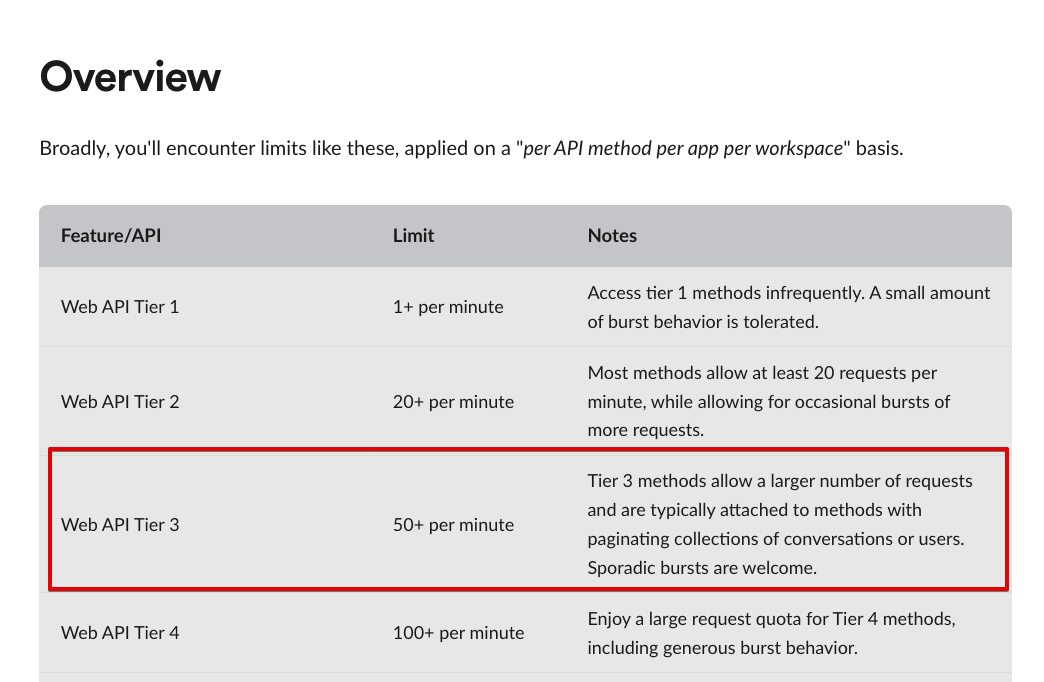 위 예제의 conversations_replies 의 경우, Rate limits 이 Tier 3 입니다.