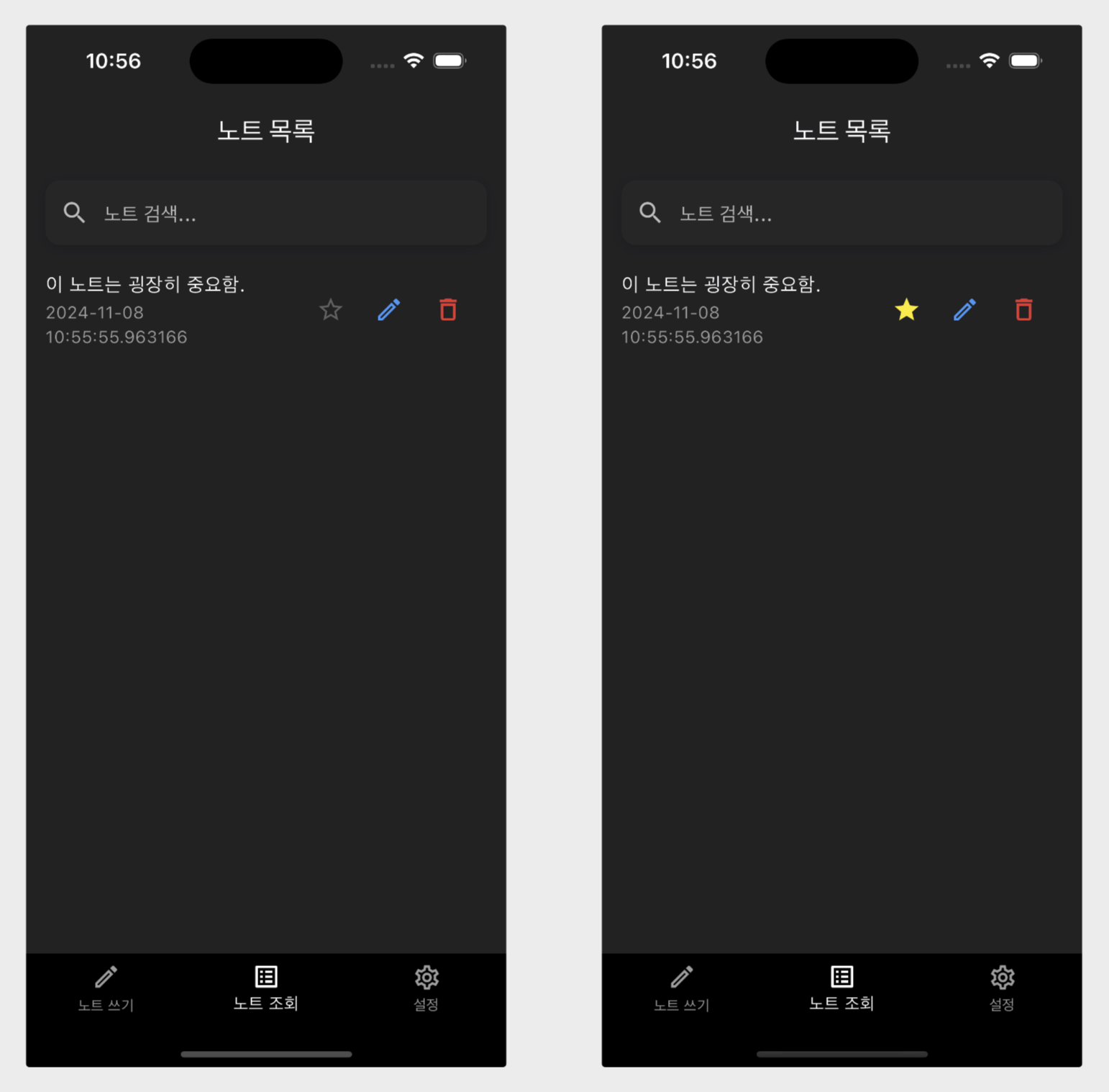 노트 목록 화면에 보이는 노트 카드에 별 아이콘을 추가하고 사용자가 클릭을 하면 토글이 되도록 하였습니다.