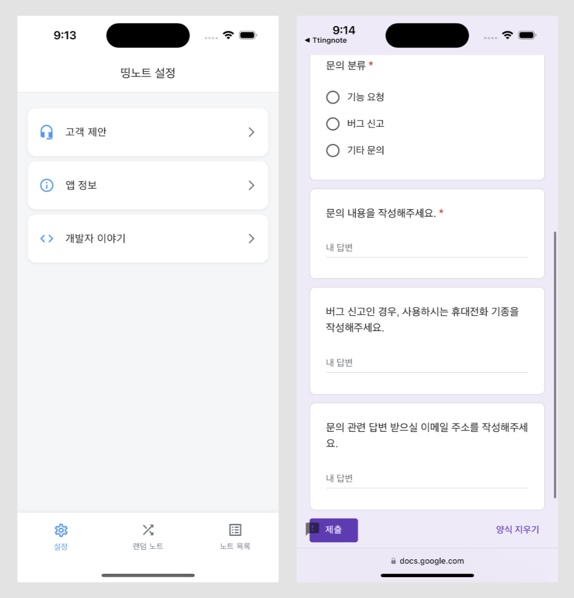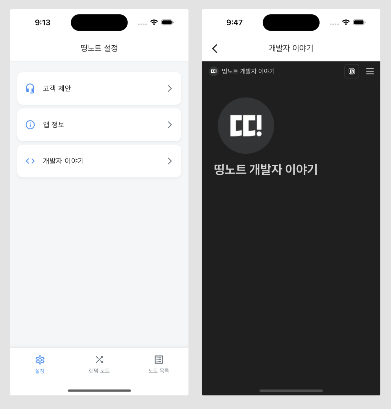 설정 메뉴에는 고객 제안과 앱 정보, 개발자 이야기 메뉴를 담아보겠습니다. 이 노트앱은 회원가입이 따로 없기 때문에 개인 정보와 계정 관리에 대한 메뉴는 추가하지 않겠습니다.
