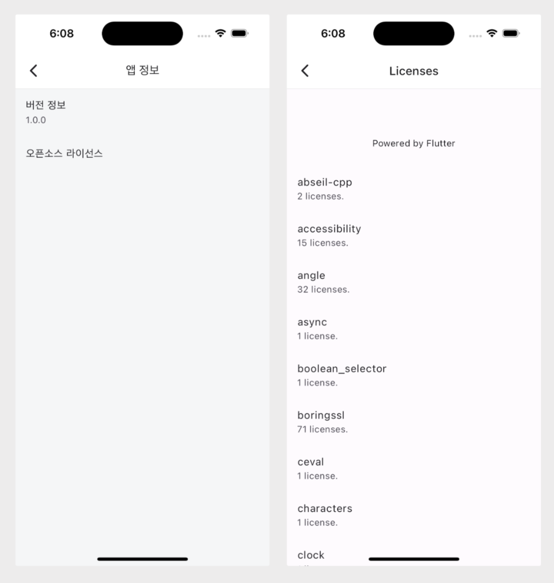 와 표시하고, 라이선스는 Flutter가 기본으로 제공하는 showLicensePage를 활용하겠습니다.