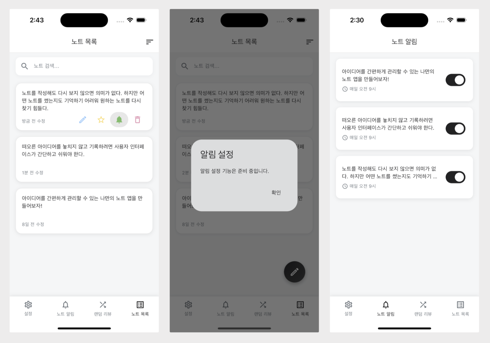 이번 글에서는 노트 알림 UI 구현 과정을 다루었습니다. 하단 탭에 '노트 알림' 탭을 추가하고 알림 관리 화면과 알림 설정 버튼을 구현했습니다.