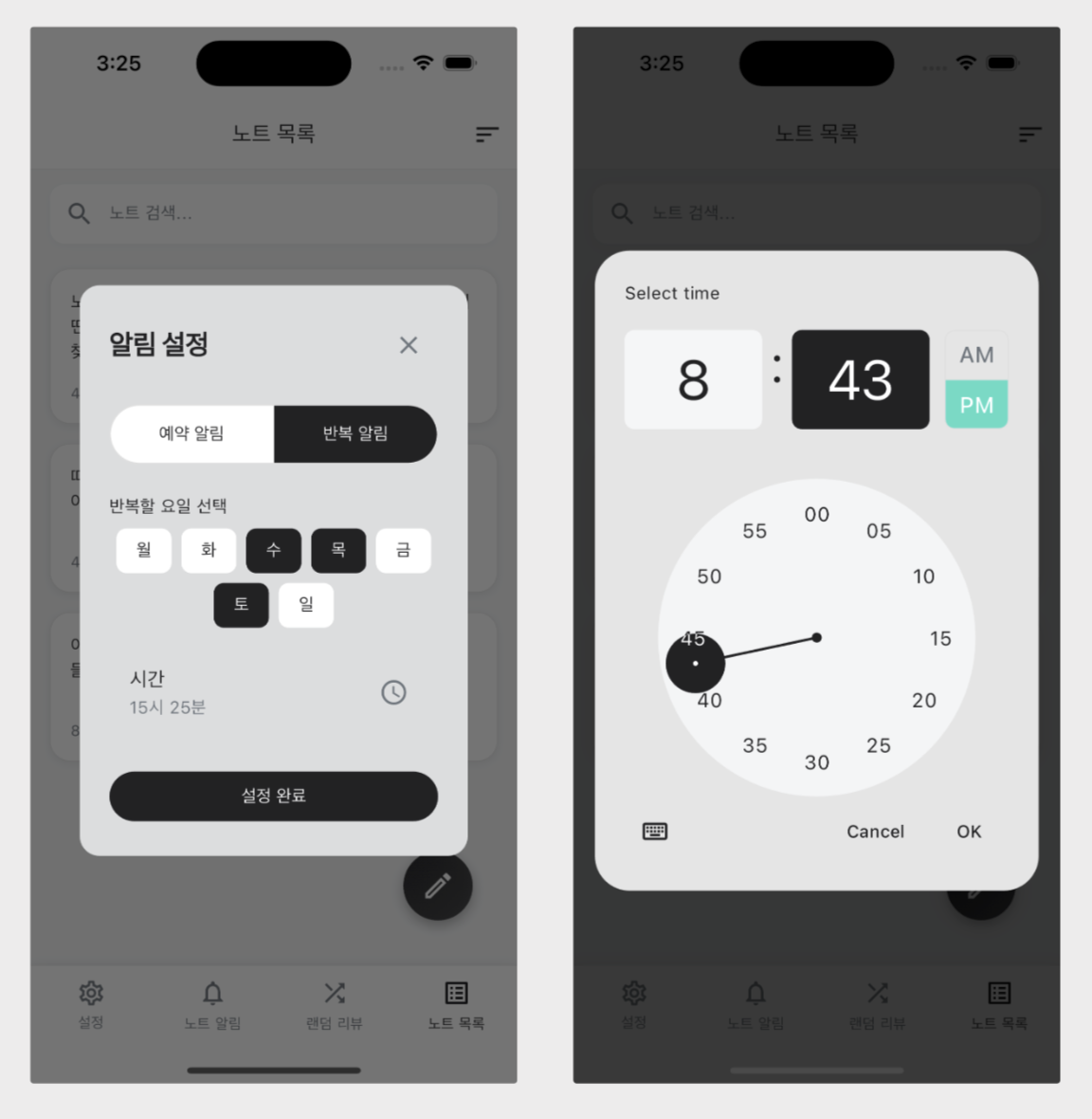 알림 설정 다이얼로그는 예약 알림/반복 알림에 따라 날짜, 시간, 요일 등을 선택할 수 있도록 구현했습니다.