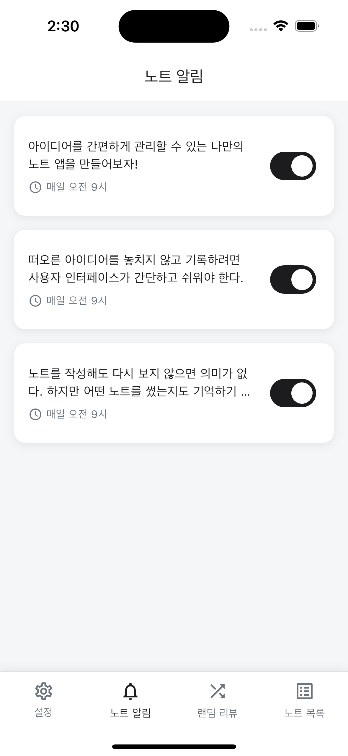 이때, 알림 카드는 노트 내용과 알림 설정 상태를 표시하며 알림 활성화 스위치를 조작할 수 있습니다.