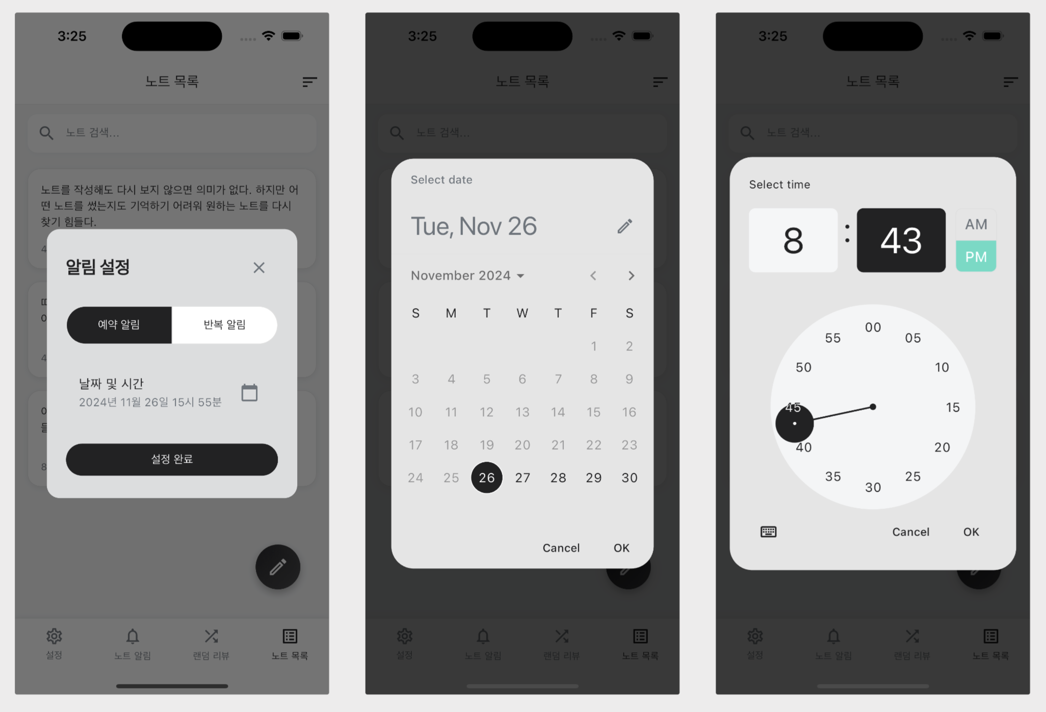 예약 알림 UI 에서는 showDatePicker와 showTimePicker를 사용하여 아래 이미지처럼 알림 날짜와 시간을 선택할 수 있습니다.