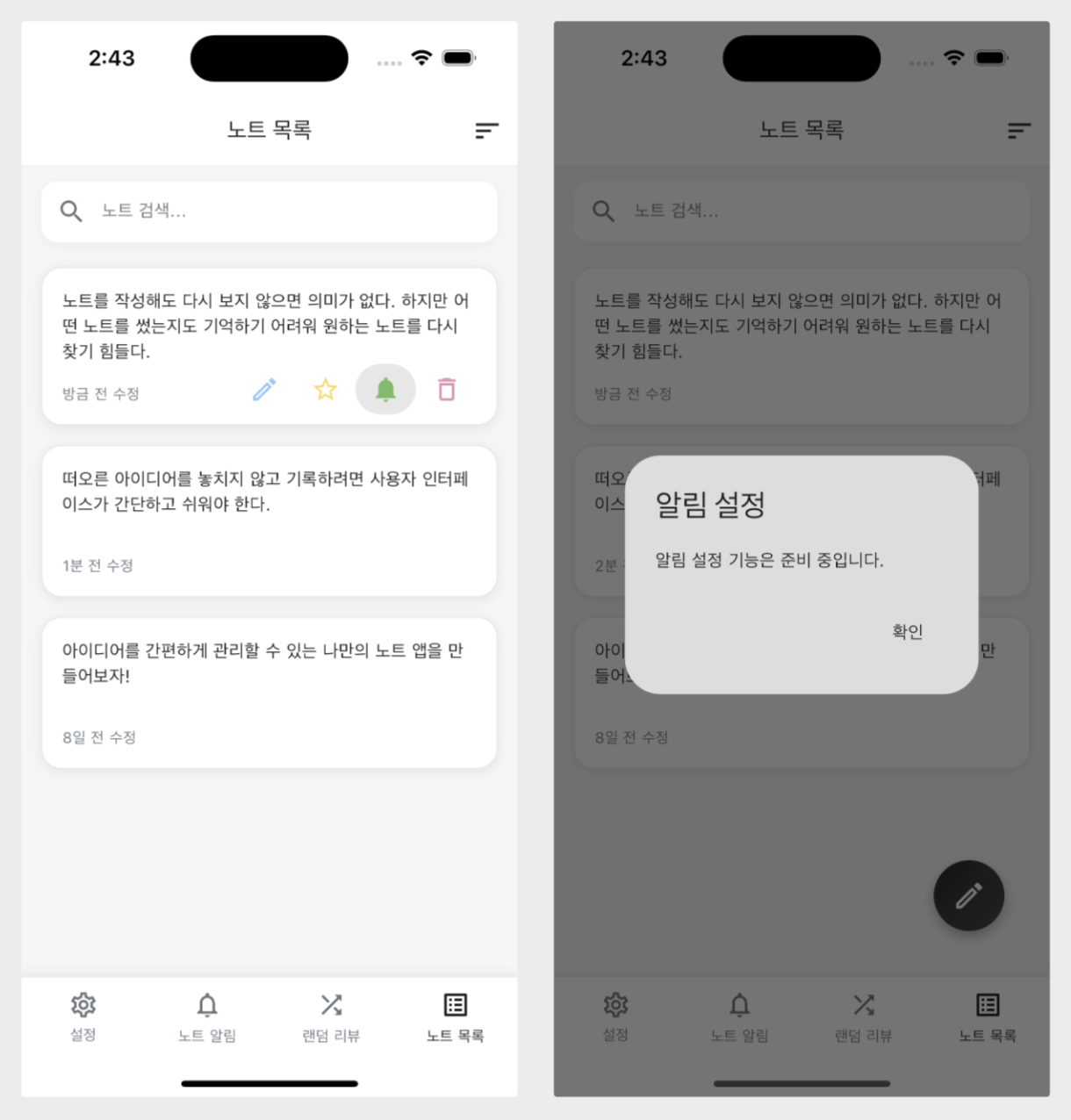 노트 알림 기능은 작성한 노트를 다시 리마인드 하는 기능입니다. 제가 만들고 있는 노트 앱은 단순히 기록하는 것뿐만 아니라 자신의 노트를 다시 발견하고, 과거 아이디어를 재활용할 수 있도록 돕는 것이 목표입니다. (그래야 멋진 노트 앱이죠~😉)