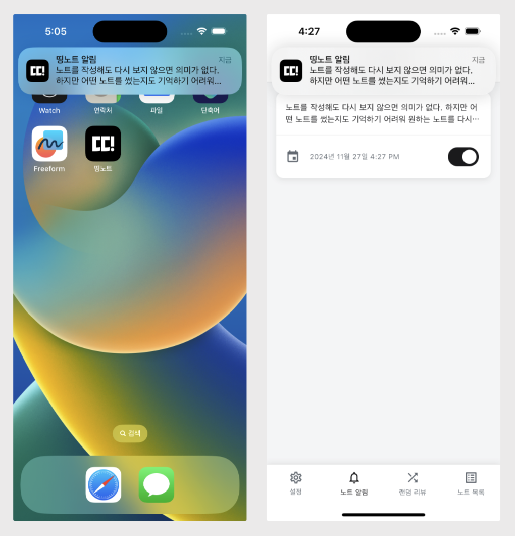 변경 전에는 앱이 백그라운드 상태에서만 알림이 왔었습니다.(왼쪽)