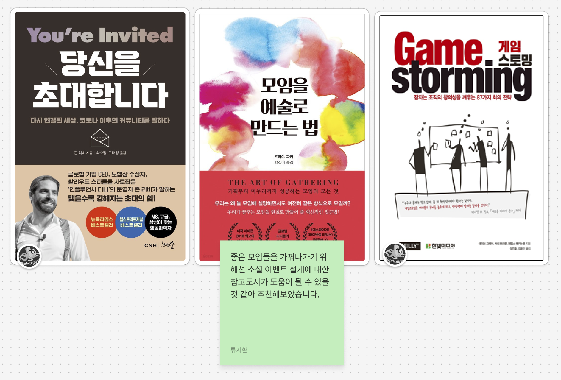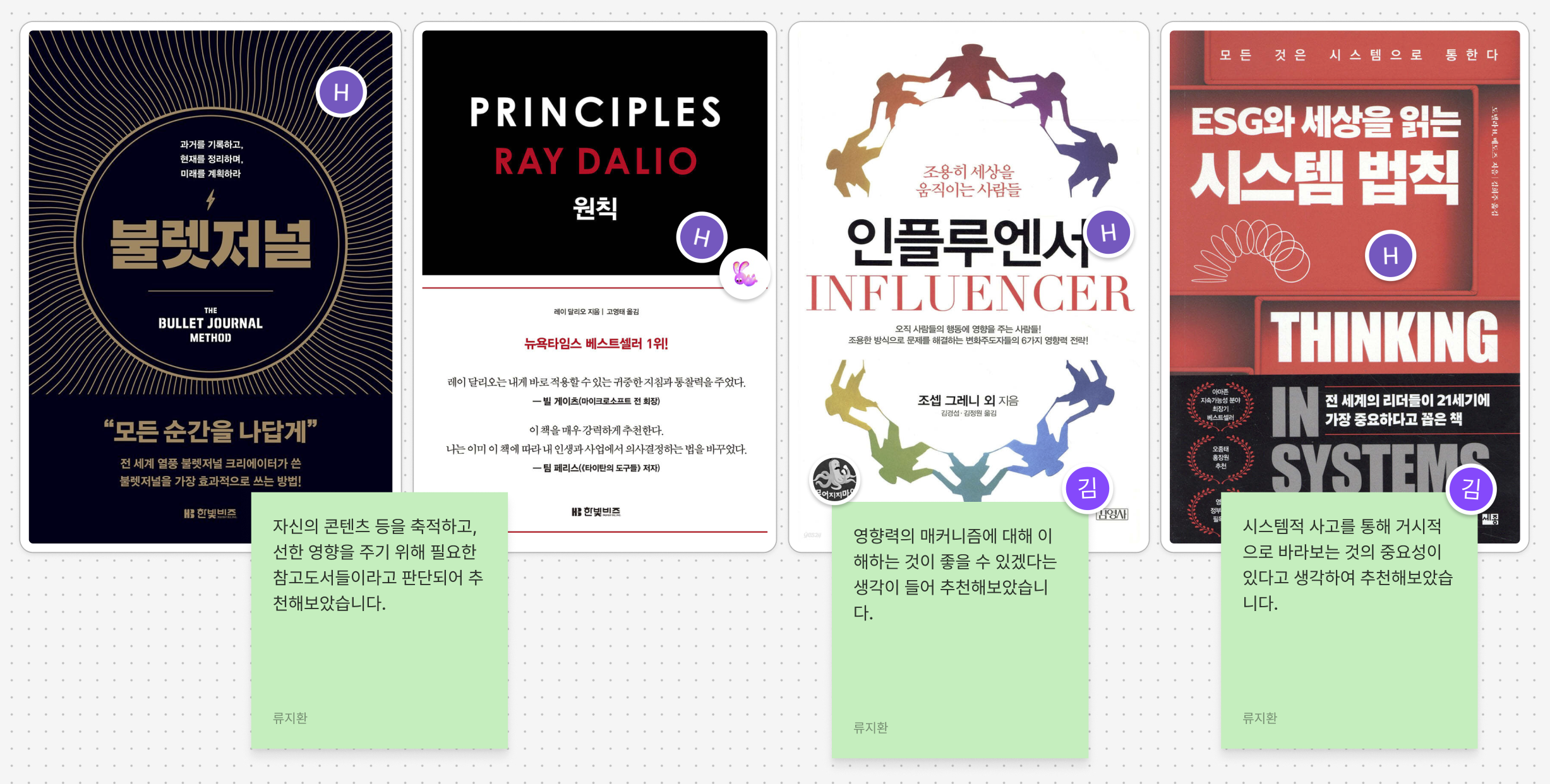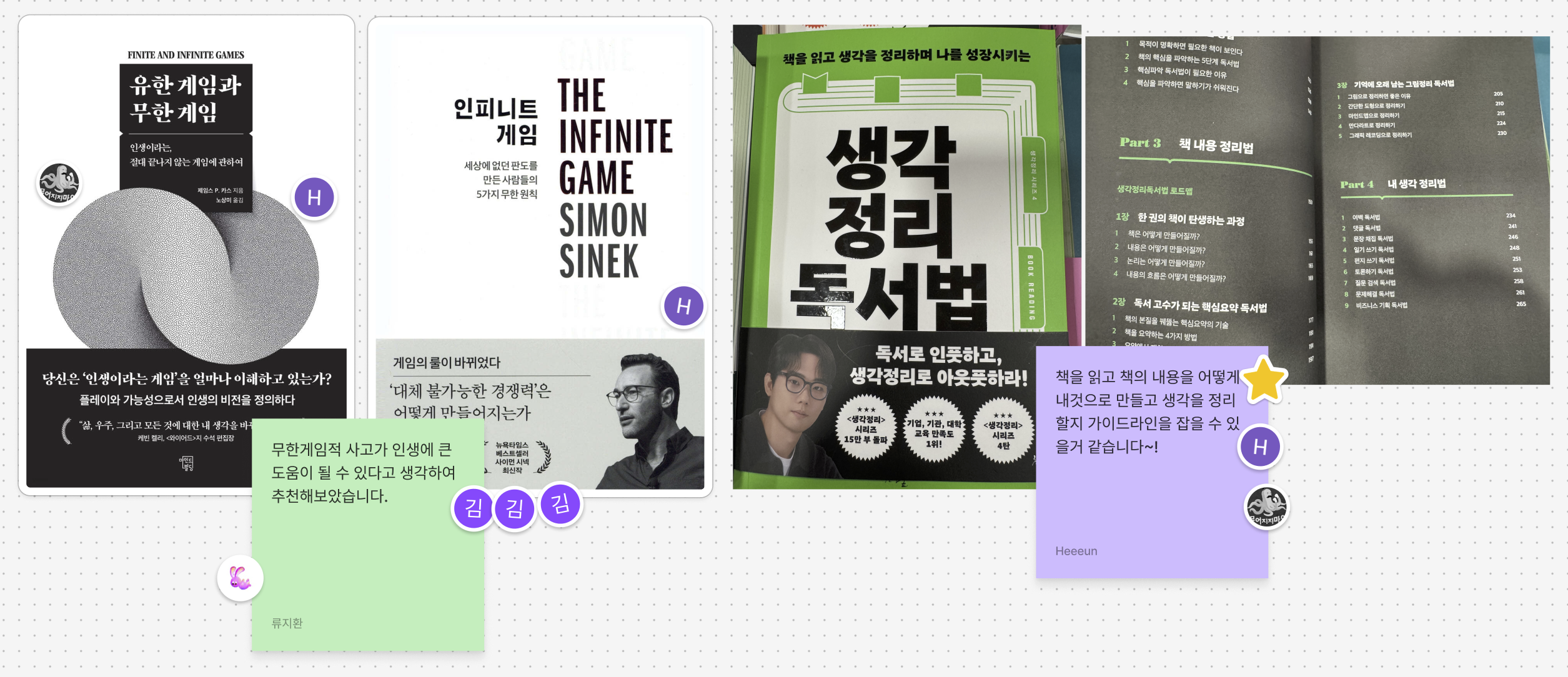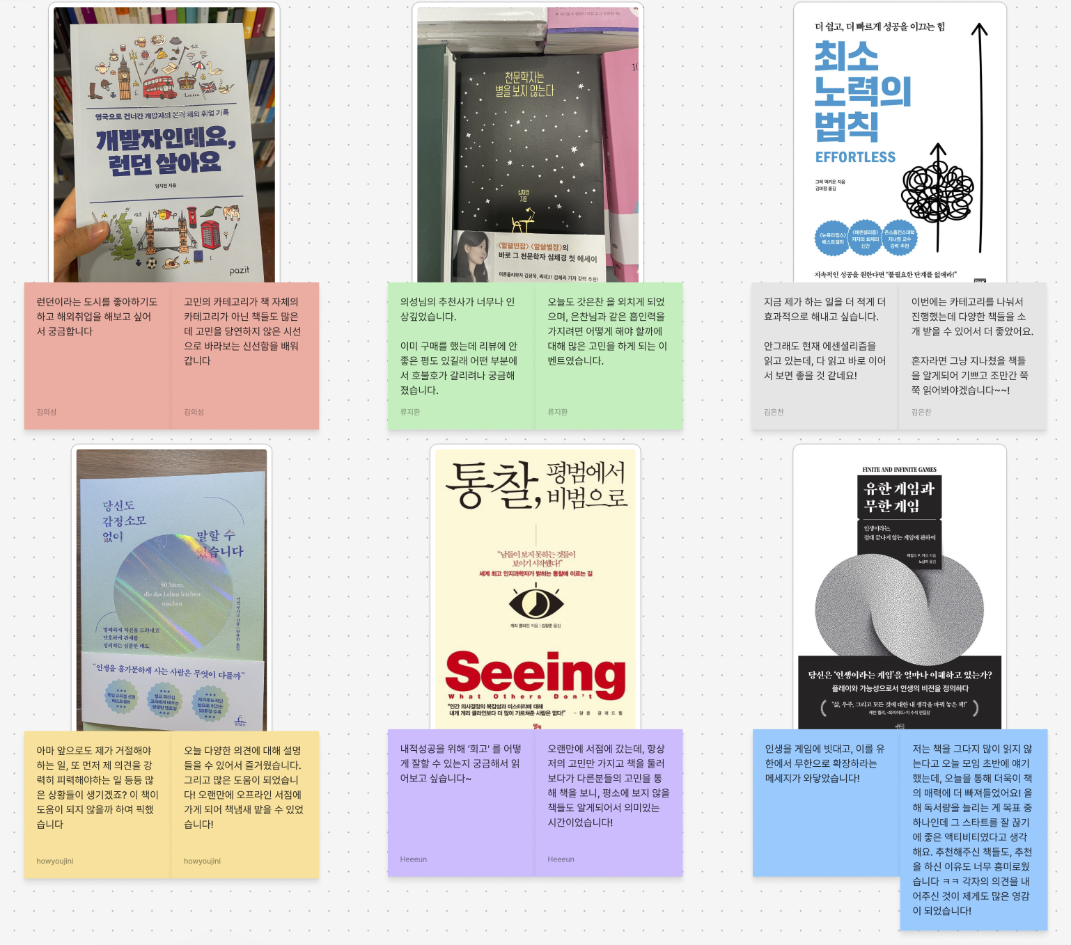 함께 책을 고르고, 경험과 생각을 나누는 과정에서 새로운 시각과 인사이트를 얻을 수 있었습니다. 함께 해주신 의성님, 지환님, 유진님, 희은님, 윤영님께 감사드립니다! (비록 참여는 못했지만 설문에 응답해주신 희주님에게도 감사!🙏)