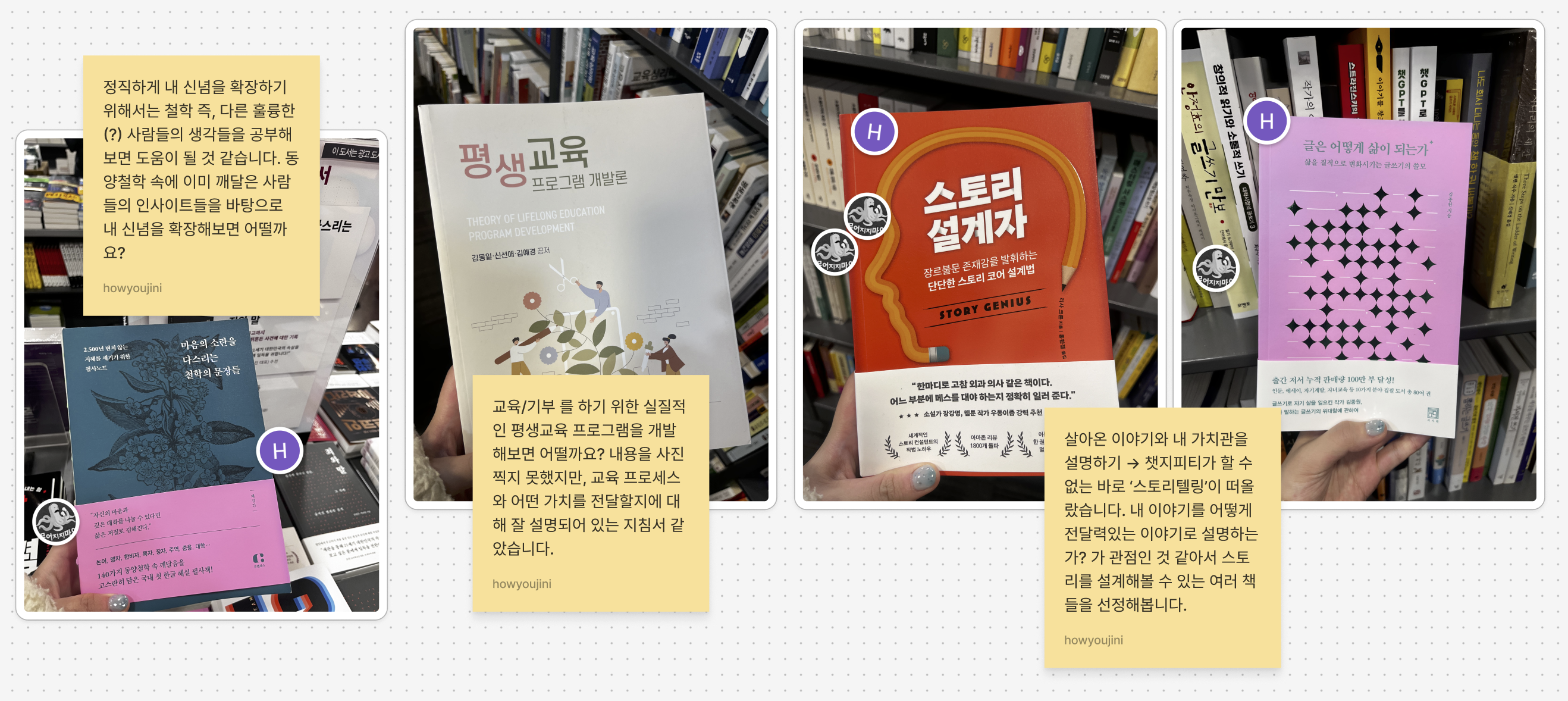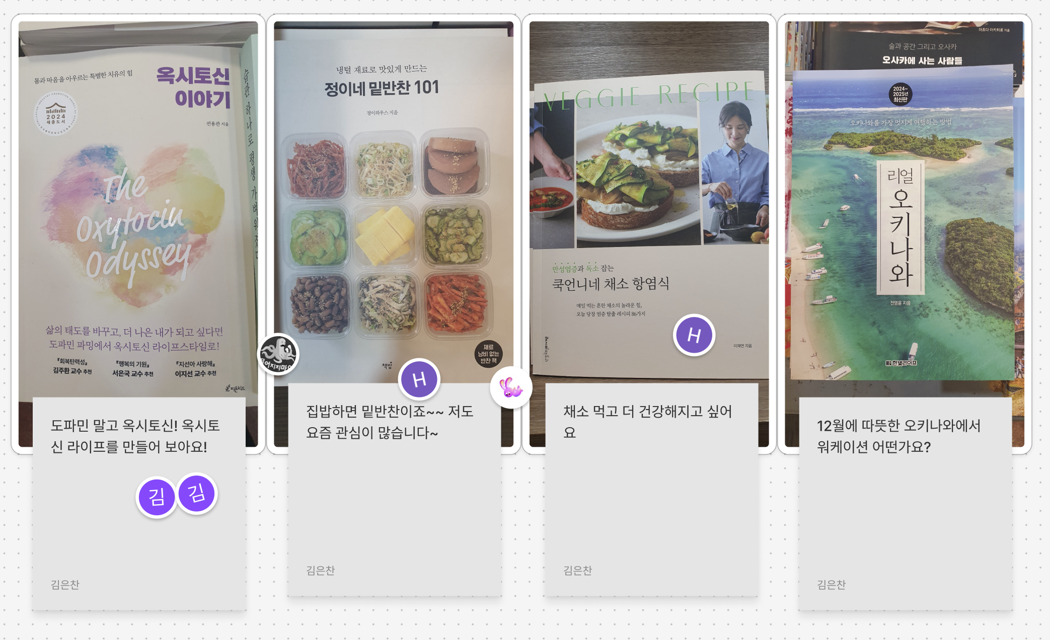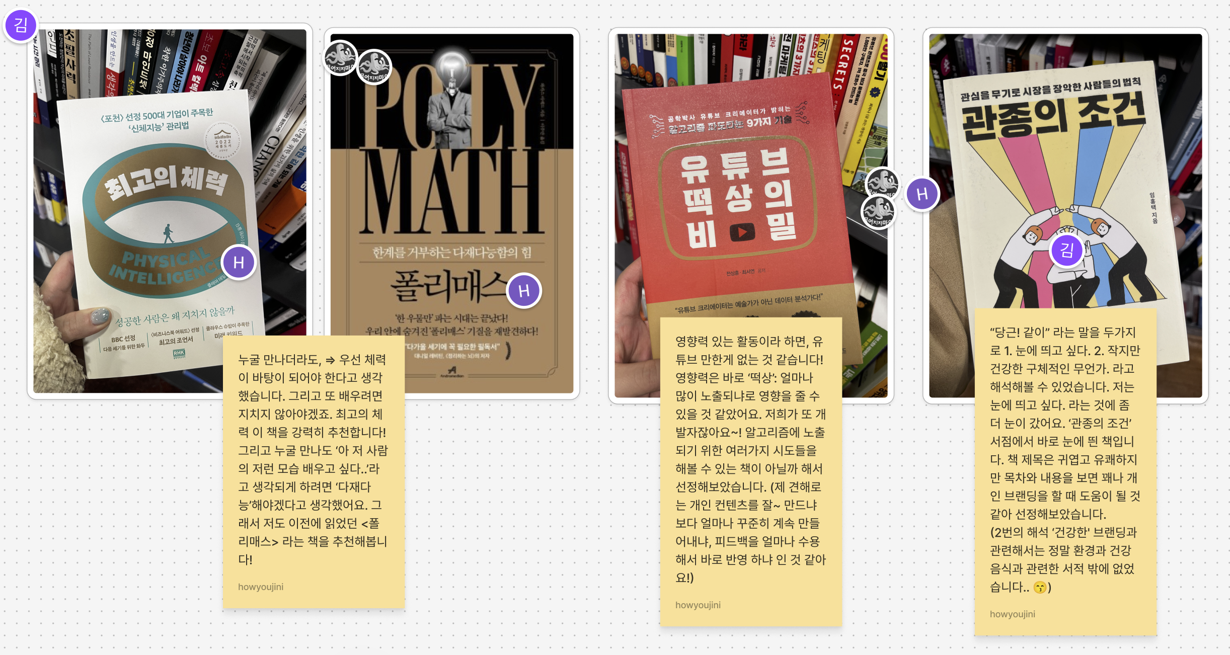 함께 책을 고르고, 경험과 생각을 나누는 과정에서 새로운 시각과 인사이트를 얻을 수 있었습니다. 함께 해주신 의성님, 지환님, 유진님, 희은님, 윤영님께 감사드립니다! (비록 참여는 못했지만 설문에 응답해주신 희주님에게도 감사!🙏)