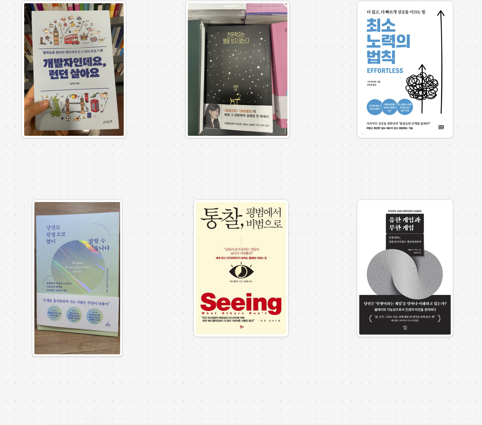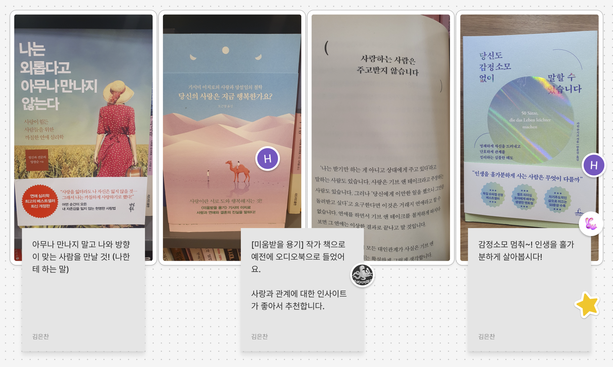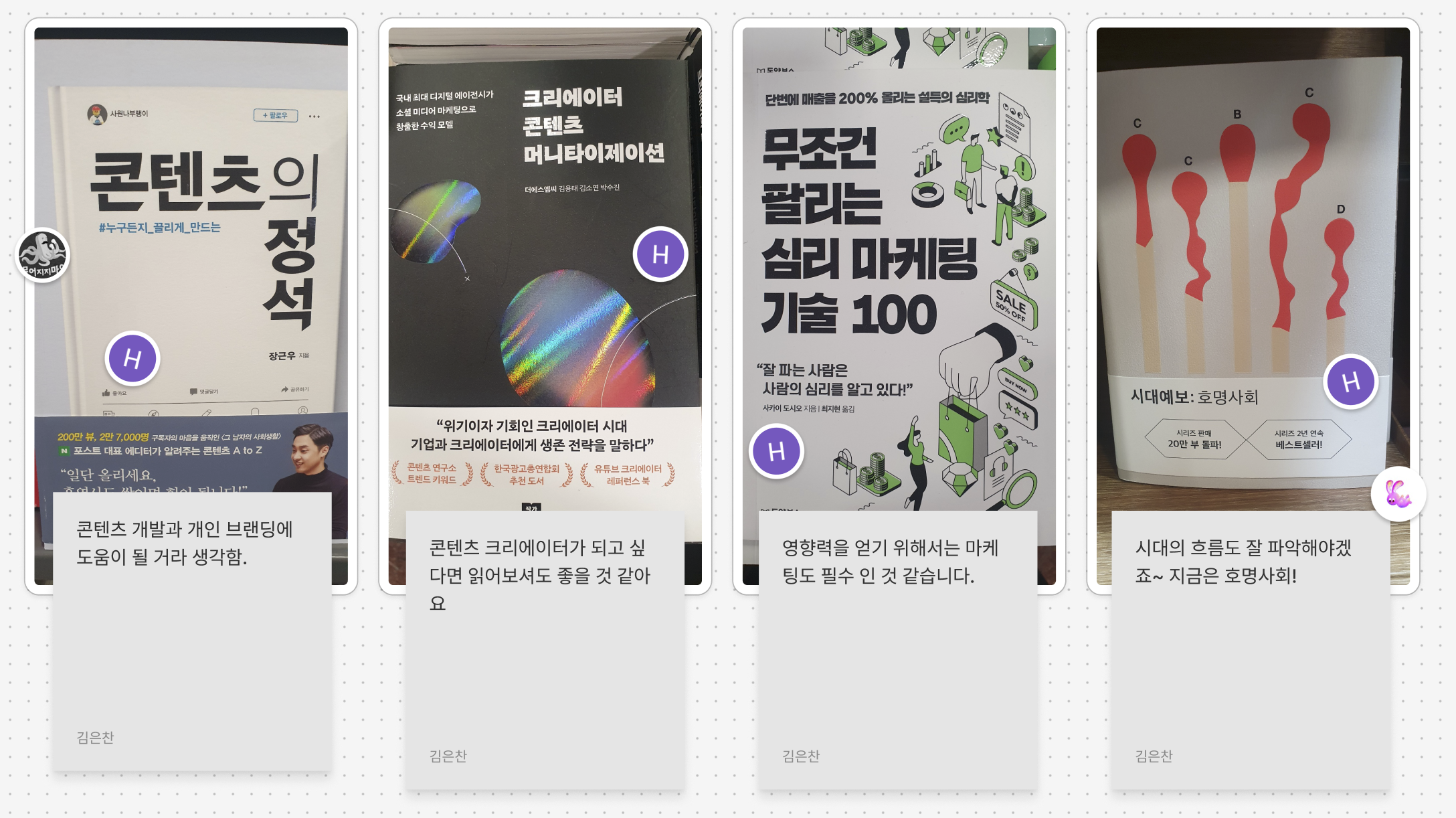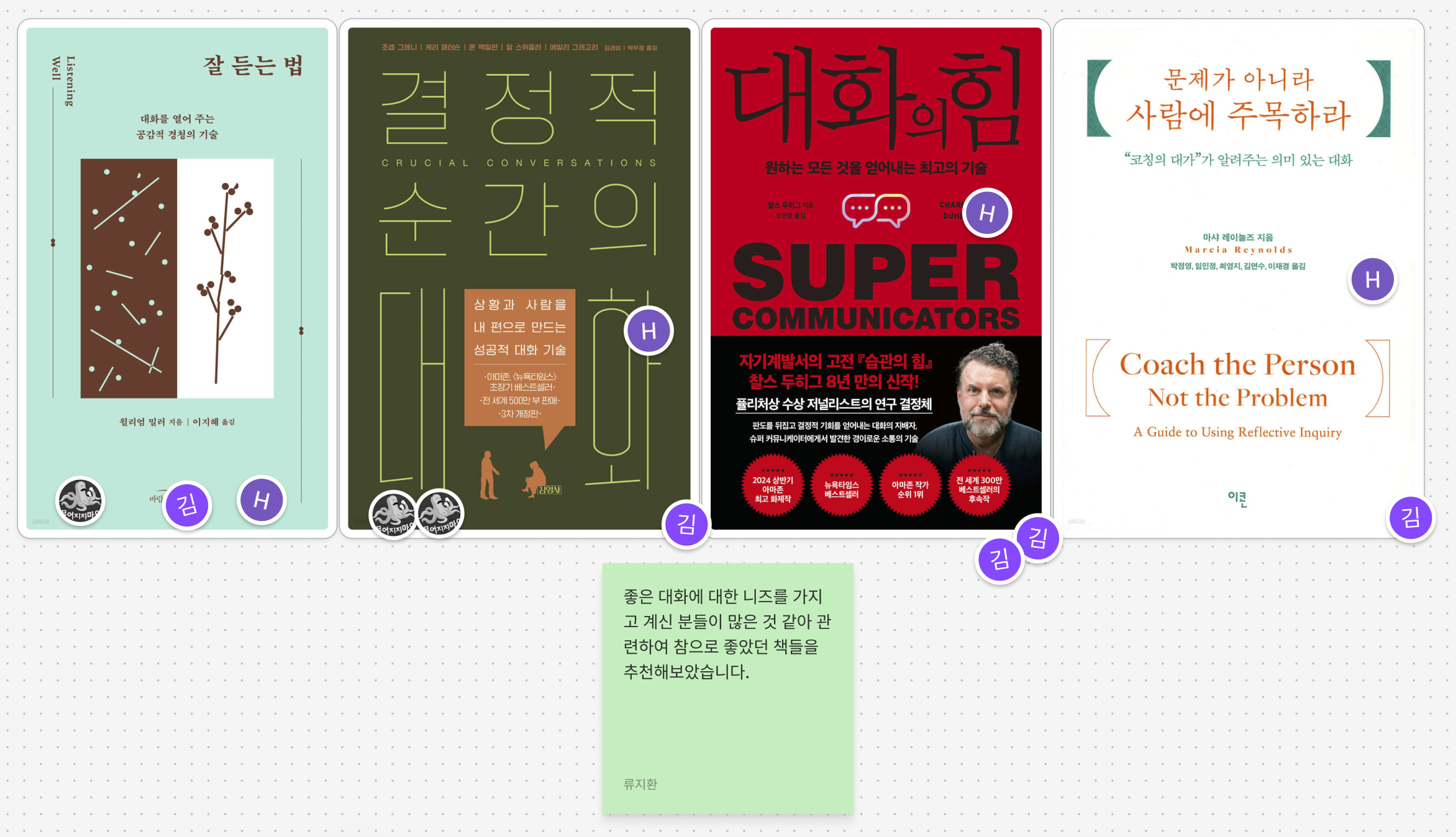 함께 책을 고르고, 경험과 생각을 나누는 과정에서 새로운 시각과 인사이트를 얻을 수 있었습니다. 함께 해주신 의성님, 지환님, 유진님, 희은님, 윤영님께 감사드립니다! (비록 참여는 못했지만 설문에 응답해주신 희주님에게도 감사!🙏)
